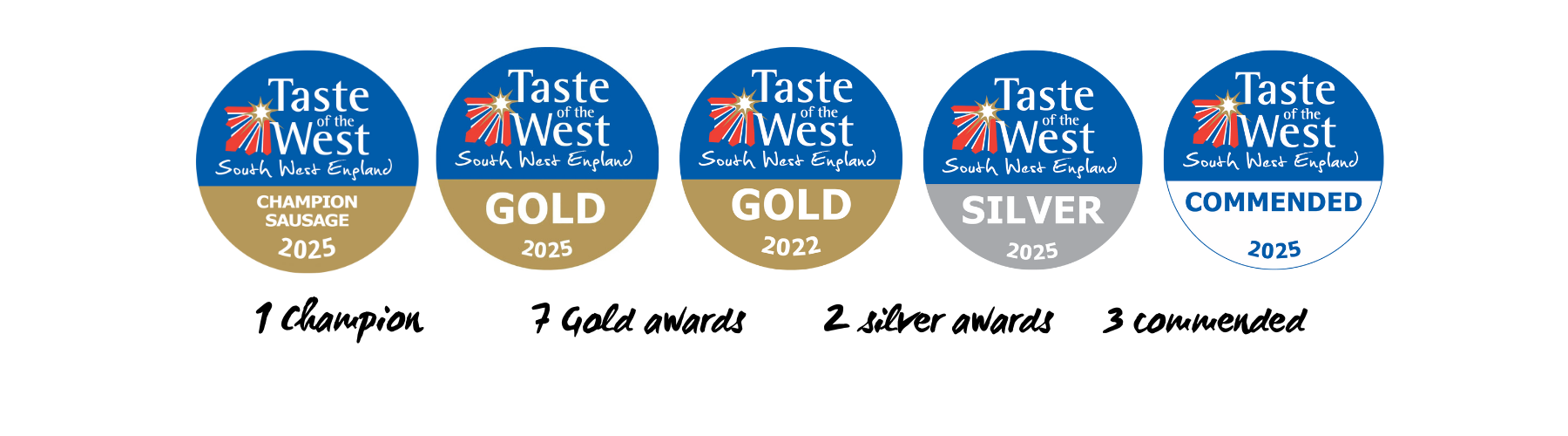 In 2025 we won 7 Gold, 2 Silver and 3 commended Taste of the West Awards plus The Breakfast Sausage won the title Champion Sausage.